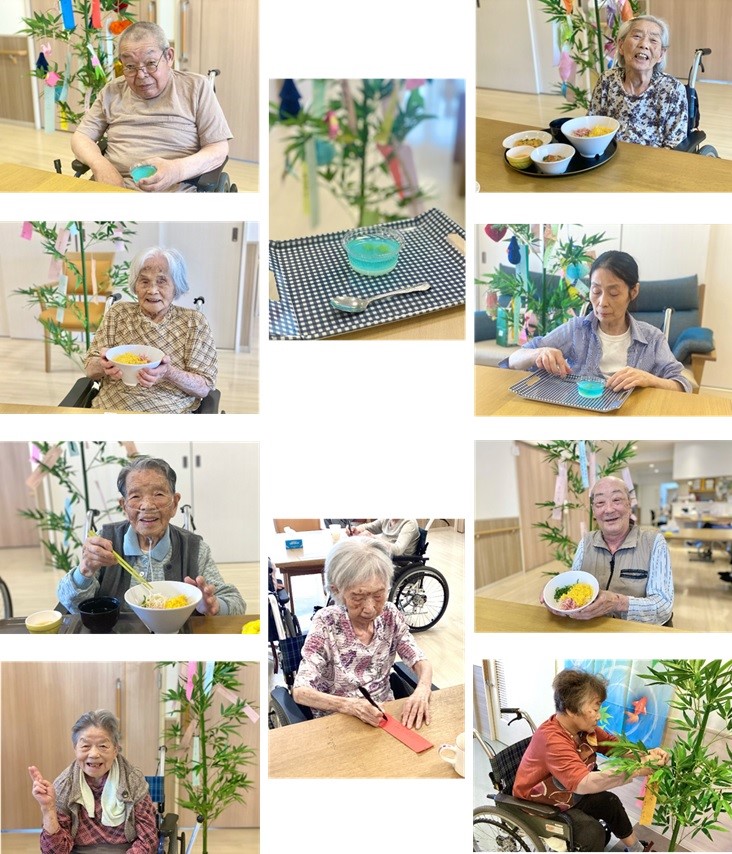 今日は7月7日七夕です。あいにくお天気は曇り空の為、天の川は見られそうにありませんが、「すないの家千種」では、お昼のメニューが ” 七夕そうめん ” でした。そうめんを天の川に見立てて流れている様子を表現している。または、そうめんを織姫が使う糸に見立てている等諸説あるようです。調べてみると面白いですよ。おやつは手作りゼリーを皆さんに食べていただきました。