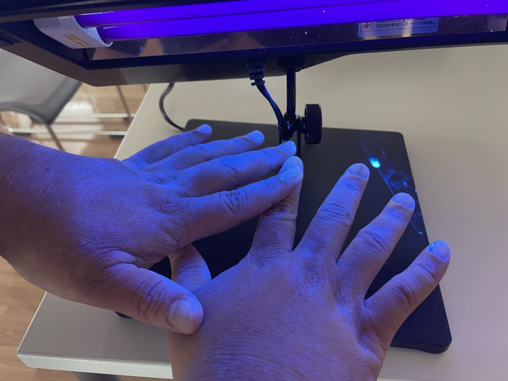 「すないの家尾張旭」では、衛生用品等でお世話になっているサラヤ㈱様より講師にきていただき、食中毒予防講習会を行いました。事例をあげていただき、私たちの身近にも食中毒が起こる可能性が あることがわかりました。蛍光塗料のクリームを手に塗り、普段通りの手洗いをし、専用のライトで照らすと汚れているところが白く光って見えます。キレイに洗ったつもりでも、洗い残しがこんなにあります。