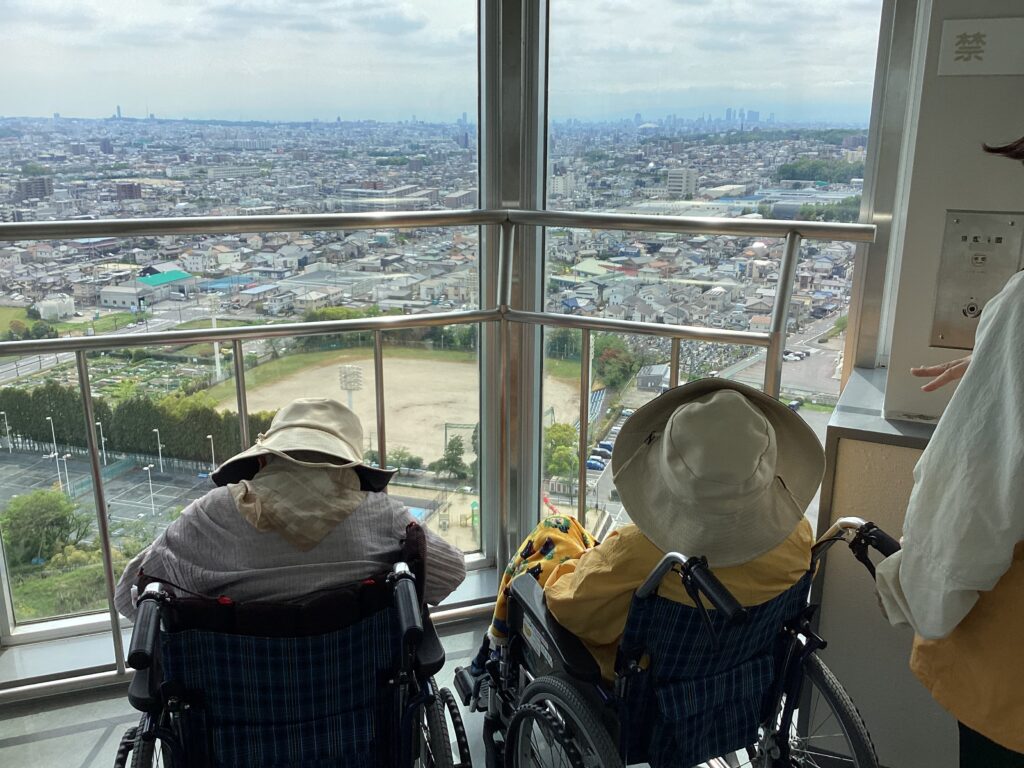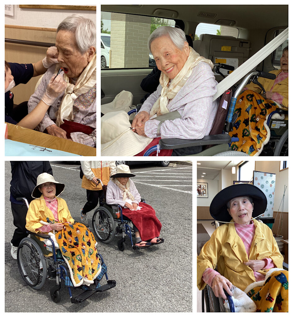 すないの家尾張旭 こすもすユニットでは4月生まれのお二人と城山公園に出掛けました。キレイにお化粧をして、ハイチーズ!!とてもよい笑顔です「行ってきまーす!!」