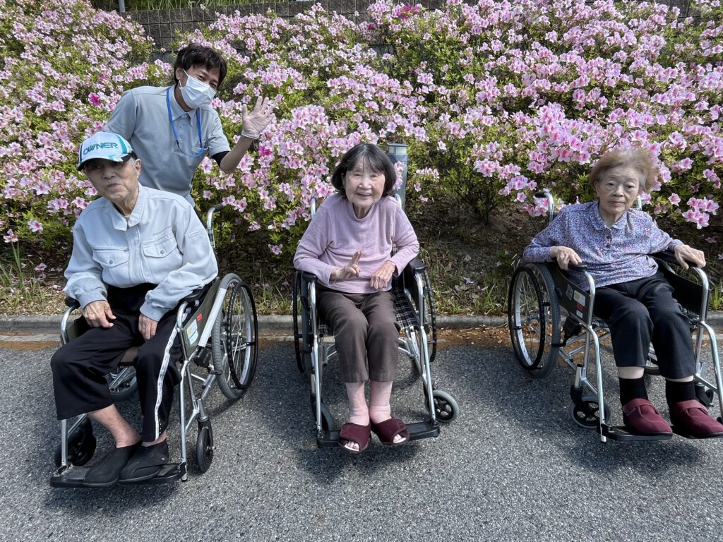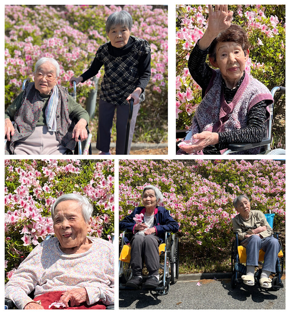 5月3日、とても爽やかな五月晴れです🍃「お散歩に行こう!!」施設の1階まで下りてゆるーい坂を上り、施設の入口まで来るとツツジが満開です🌸