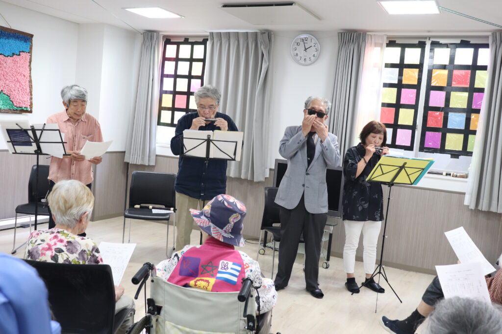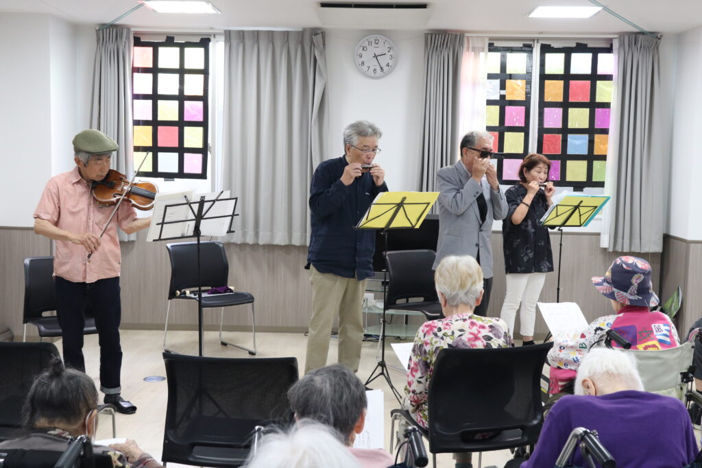 5月24日(金)ヴァイオリン、ハーモニカ、アルトリコーダー等を演奏し、懐かしい曲を披露してくださいました。とても優しい音色で入居者の方は癒されていました。歌詞カードが配られたのですが、見なくても歌える曲が多かったので、大きな声で歌ってくださり、楽しいひと時を過ごしました。