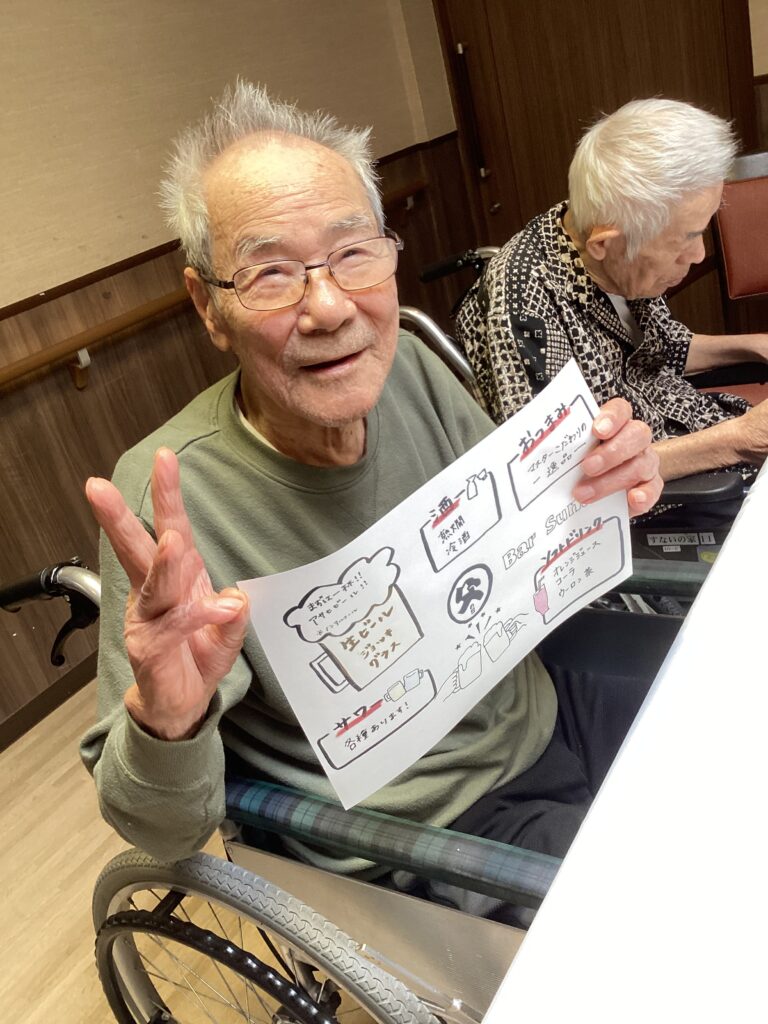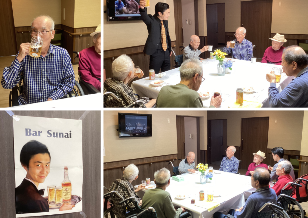 6月16日に「父の日」としまして、男性だけの集まり”BARすない”を開催いたしました。男性の入居者様・職員が集まり、楽しいひとときを過ごしました。