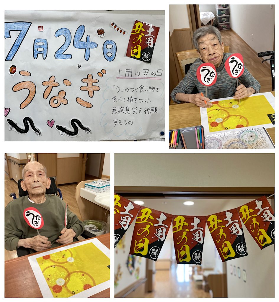 7月24日は土用の丑でしたね。すないの家尾張旭では、昼食にうなぎ丼ぶりの提供をさせていただきました。ユニットでは飾りつけをし、土用の丑の日をお知らせしました。「今日はうなぎの日なのね」と皆さん笑顔です。