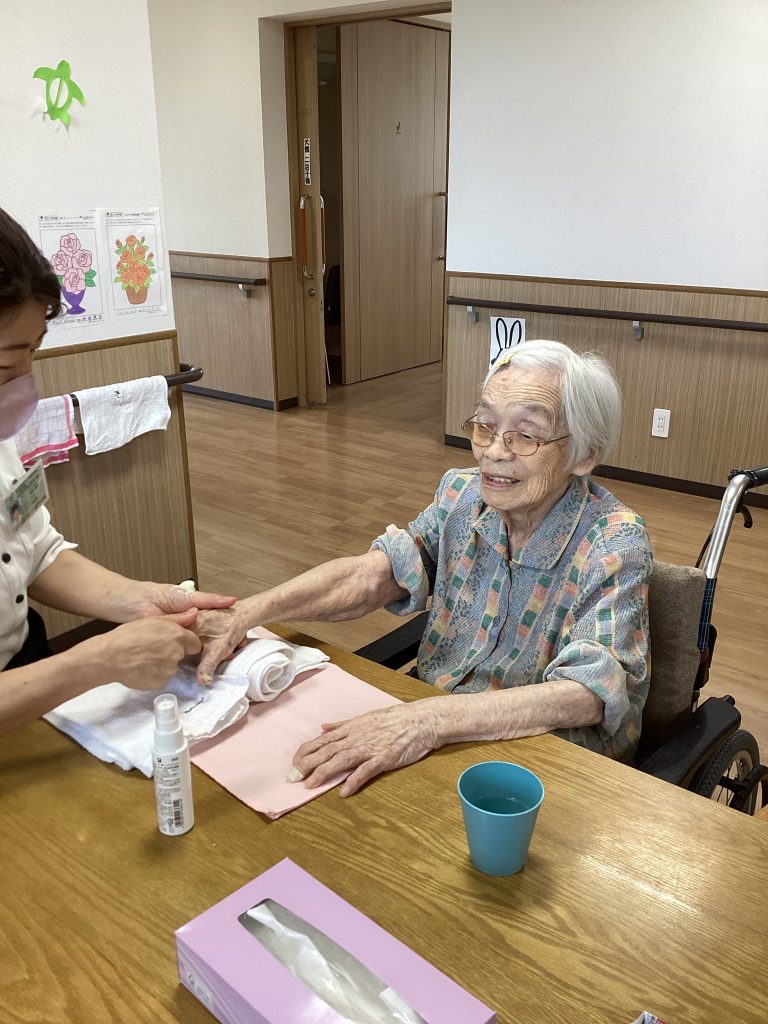 グループホームすないの家尾張旭ではハンドセラピストさんをお招きしハンドマッサージをしていただきました。一人ずつお話をしながら、指先から腕までをマッサージして頂きました。