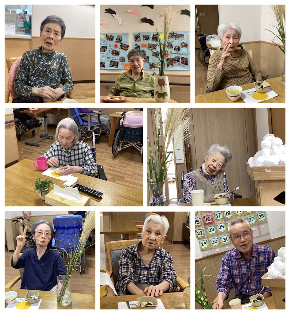 おやつは、月見団子を召し上がっていただきました。あんこ・きなこ・黒蜜・抹茶パウダー・チョコレートの中から好きな物を選んでいただきます。