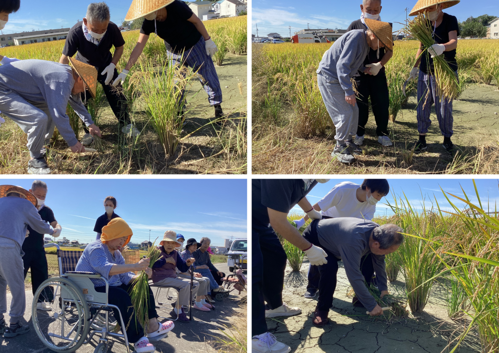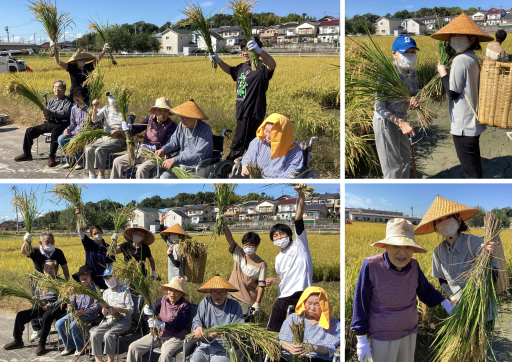 10月になっても夏日が続いています。暑いくらいの天気ですが気持ちよく稲刈りできました。皆さまの普段の様子とは違い、いつもは歩かない草の上を歩き、元気に稲刈りをしました。