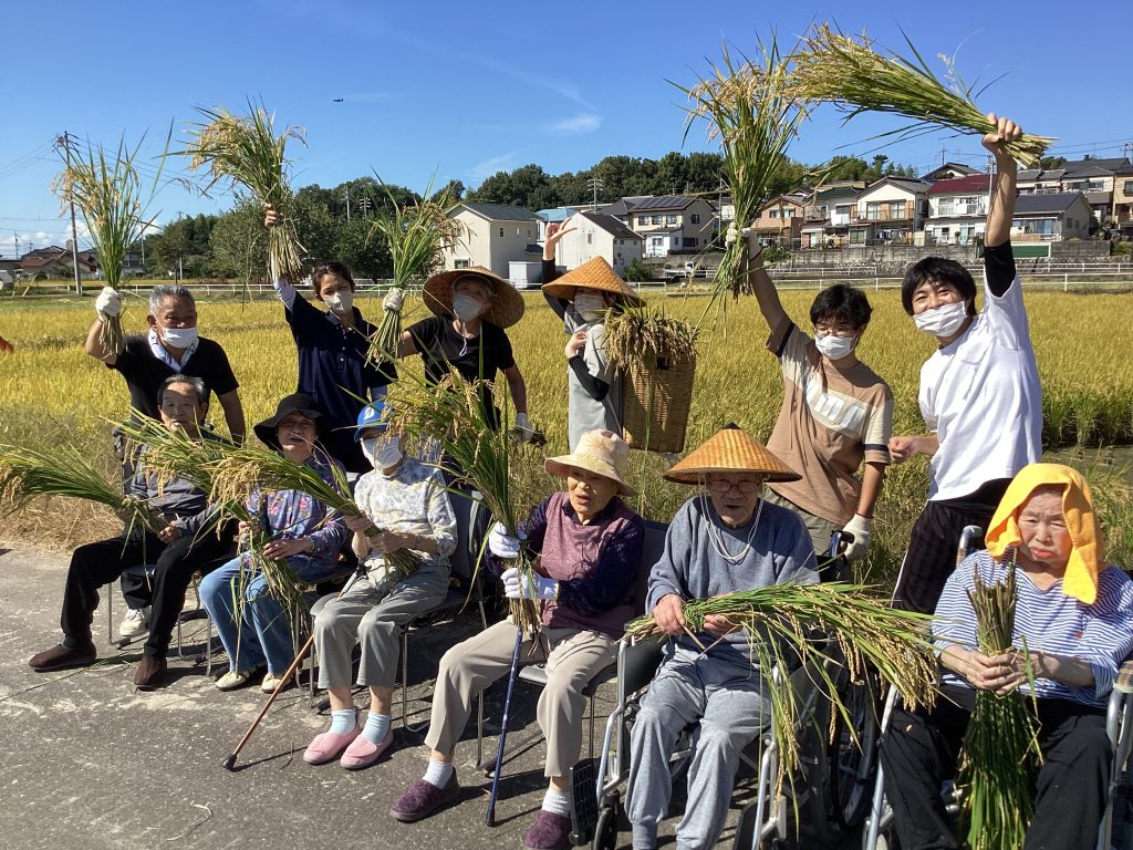 稲刈りを終え、皆さんで記念撮影をしました。「始めて稲刈りしました!」と喜ばれたり、「楽しかった!」と笑顔でお話いただきました。