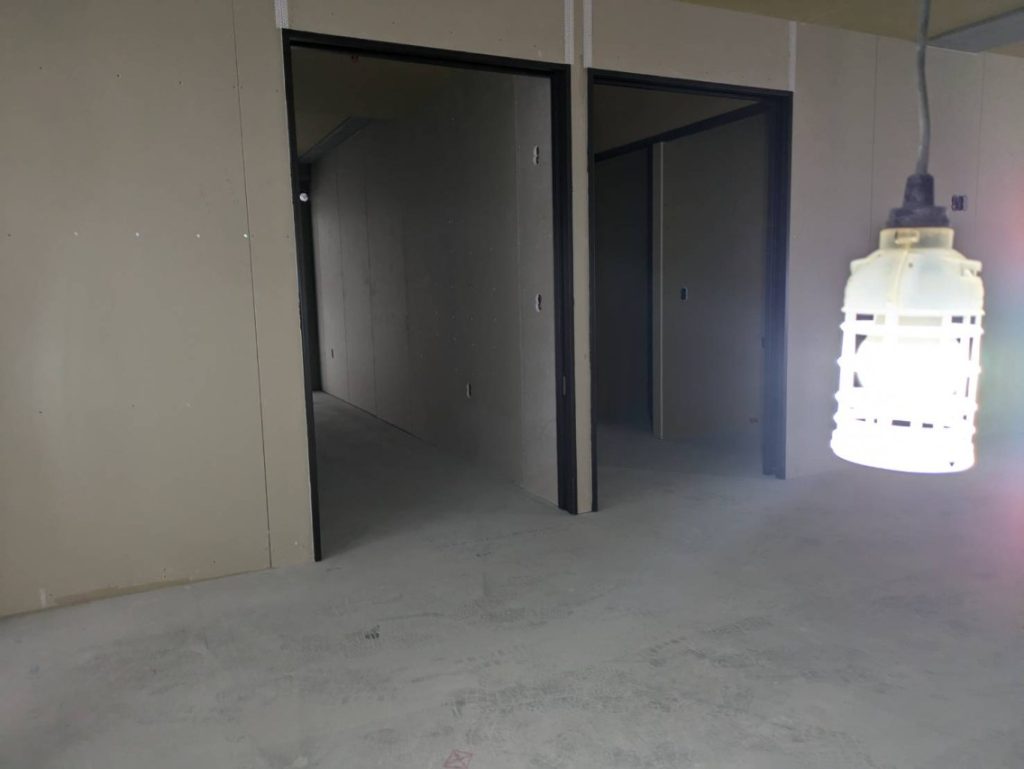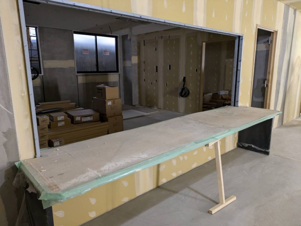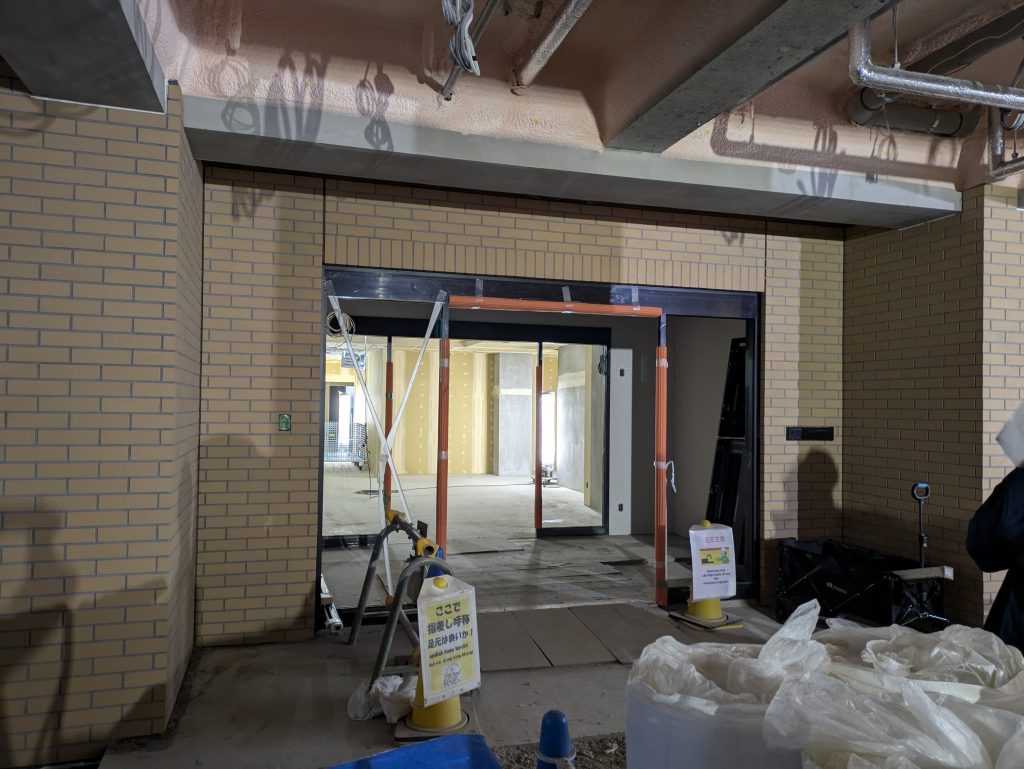 正面玄関から入って左手に事務所があります。それぞれの部屋の入り口が出来上がっています。