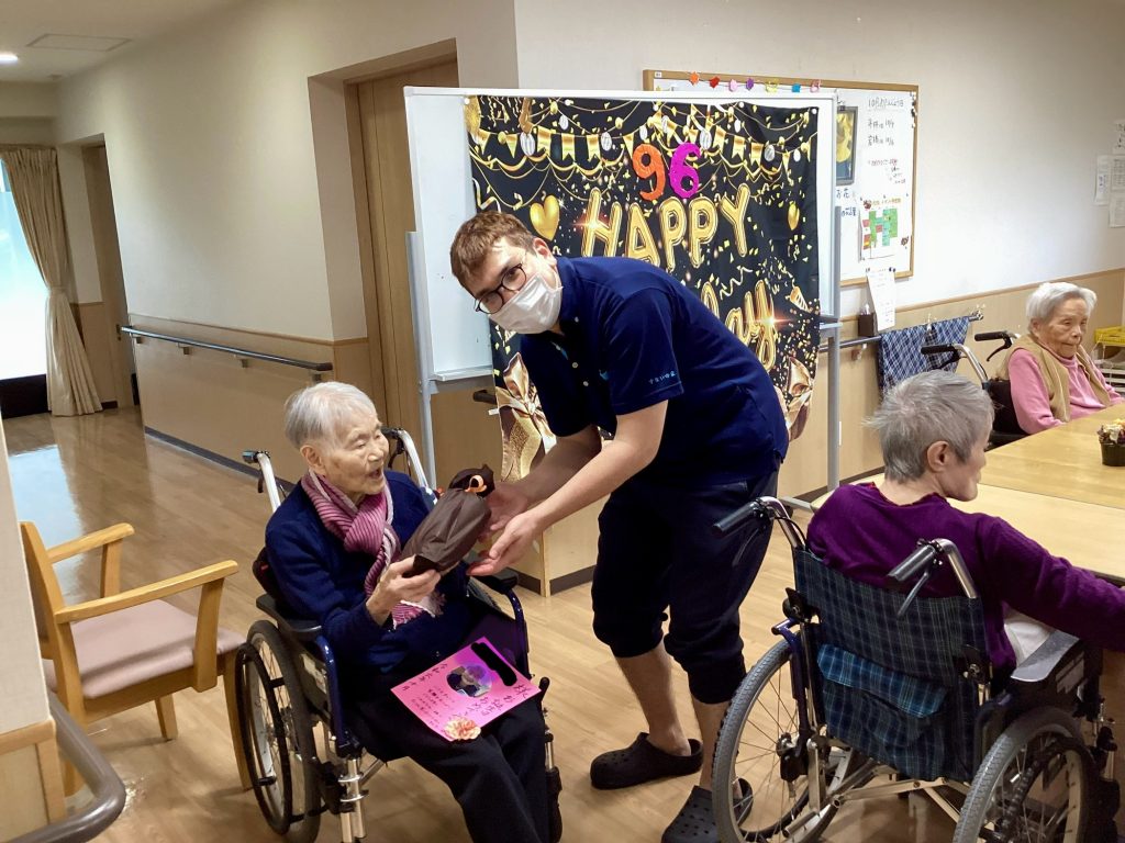 プレゼントをスタッフからいただきました🎁足元が冷えないようにひざ掛けのプレゼントです。お誕生日の入居者さまを囲んで、ティータイムです。スタッフ手作りの鬼まんじゅうです。「昔はお芋が主食だったのよ🍠」と話が盛り上がります。