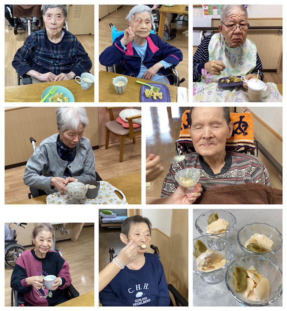 ほうじ茶ラテと鬼まんじゅうでティータイムです。バニラアイスとお芋ペーストで食べて頂いた方もあります。皆さま大好きなお芋のデザートで楽しい時間を過ごせました。