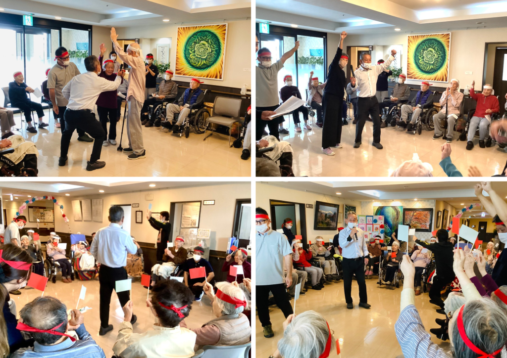 すないの家春日井で運動会を行いました。利用者様の選手宣誓により始まり、元気にエールを送ります! 旗揚げゲームでは、間違いもありながら、皆さん頑張ってみえました。