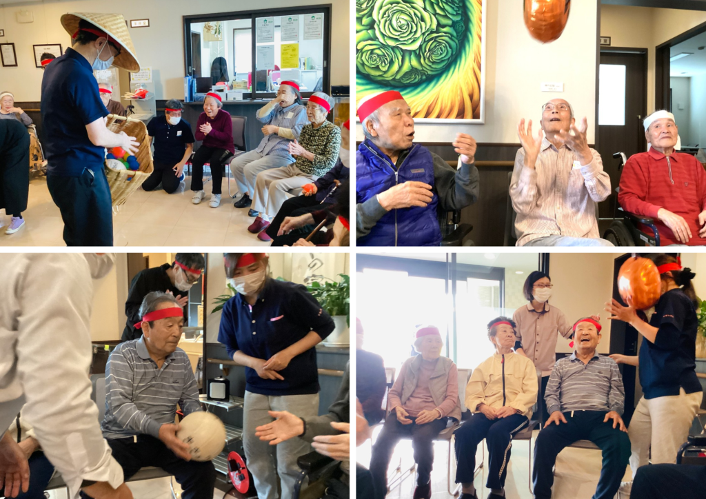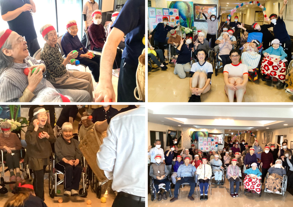 玉入れやボール回し、風船バレーをみなさん楽しく行いました。職員による余興もあり、笑顔いっぱいでした。最後は記念撮影して楽しい時間を過ごしました。