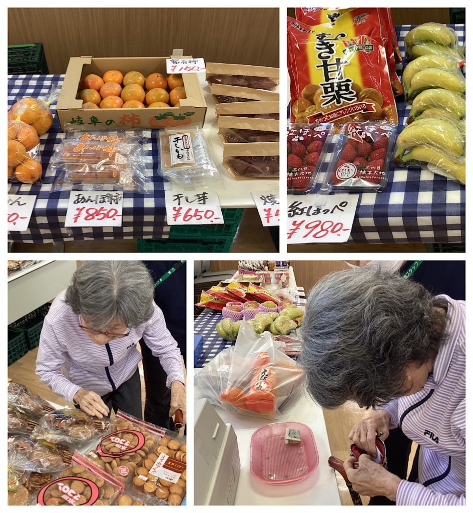 ミカン、柿、リンゴ、焼き芋など季節の食べ物が並んでいます。ミカンと焼き芋はすぐに完売です!!