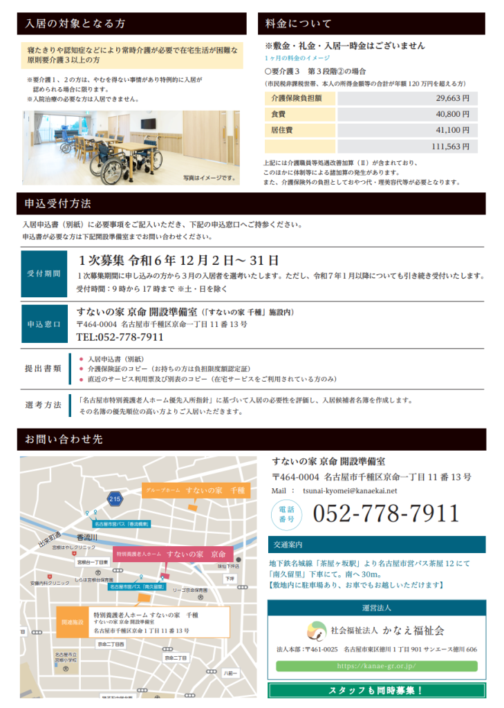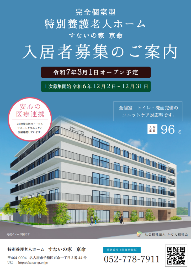 2024年12月より「特別養護老人ホームすないの家京命」の入居者募集が開始しました。ユニット型個室で96名の方がご入居いただけます。お申込み窓口:すないの家京命 開設準備室(名古屋市千種区京命1-11-13)【電話 052-778-7911】入居の対象となる方:介護認定要介護度3以上の方提出書類:入居申込書(事業所にありますのでお問い合わせください)・介護保険証のコピーお申し込みは随時受け付けておりますのでお気軽にご連絡ください。
