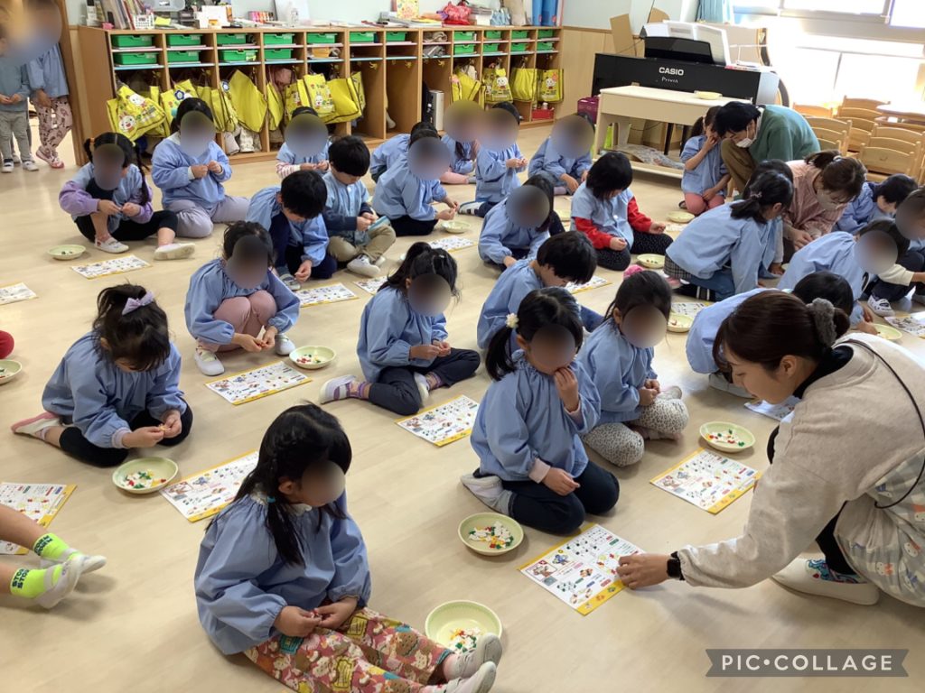 また、幼児クラスでは一人ひとつずつコマのセットをもらい、自分で組み立てました。 早く出来上がった子がまだできていないお友だちを手伝ったり、「こうするとできるよ」と教えてくれる姿がたくさん見られました。