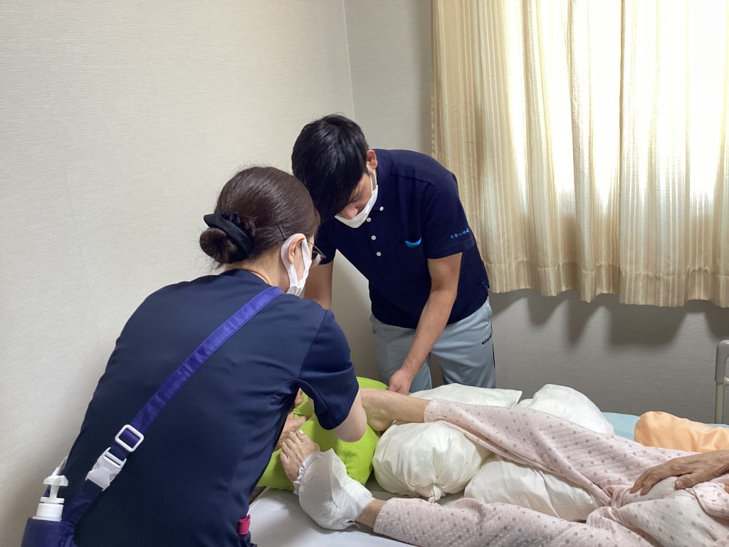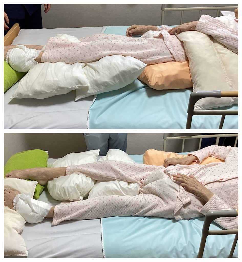 実際に入居者様で教えていただきました。入居者様と確認しながらクッションをあてていきます。少し関節が曲がっているほうが楽なようです。