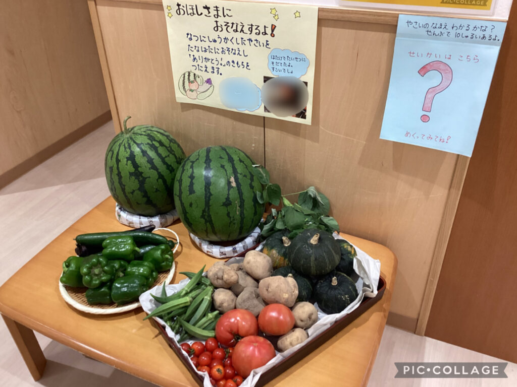 園内には、たなばたのお供えとして夏野菜もたくさん並びました🍆🥒🍅