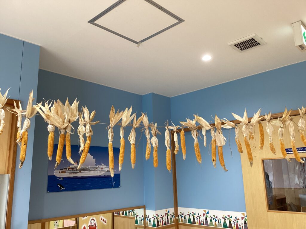 収穫して皮をむいたとうもろこしは、ただいま玄関で干しています!