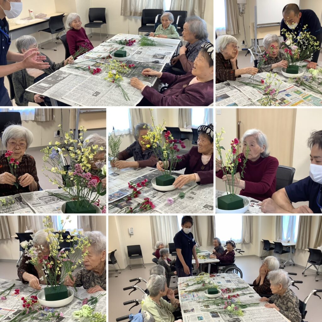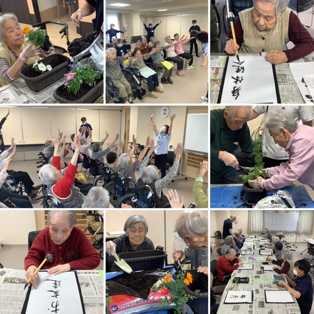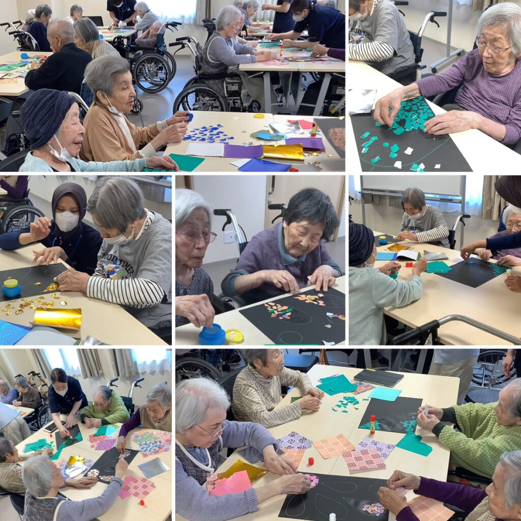 暑い日が続きますが、すないの家太秦では、ちぎり絵、体操、園芸、お習字、生け花など様々な室内レクリエーションを開催しています。