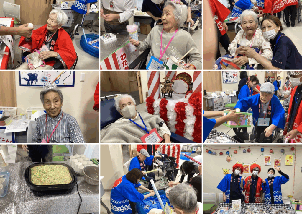 やぐらも太鼓もスタッフの手作り!看板は入居者様が書いてくださいました。