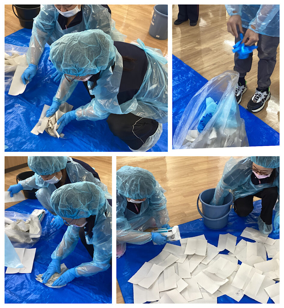 今回は吐物処理を中心に教えていただきました。吐物が皮膚に触れたり吸い込まないよう注意します。吐物を広げないよう片付けまでしっかり行います。