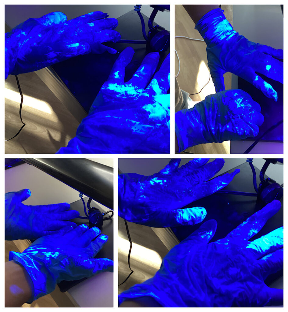 専用のライトをあてると、手には汚れがたくさん付いています。手袋を過信することなくケアをしていきます。