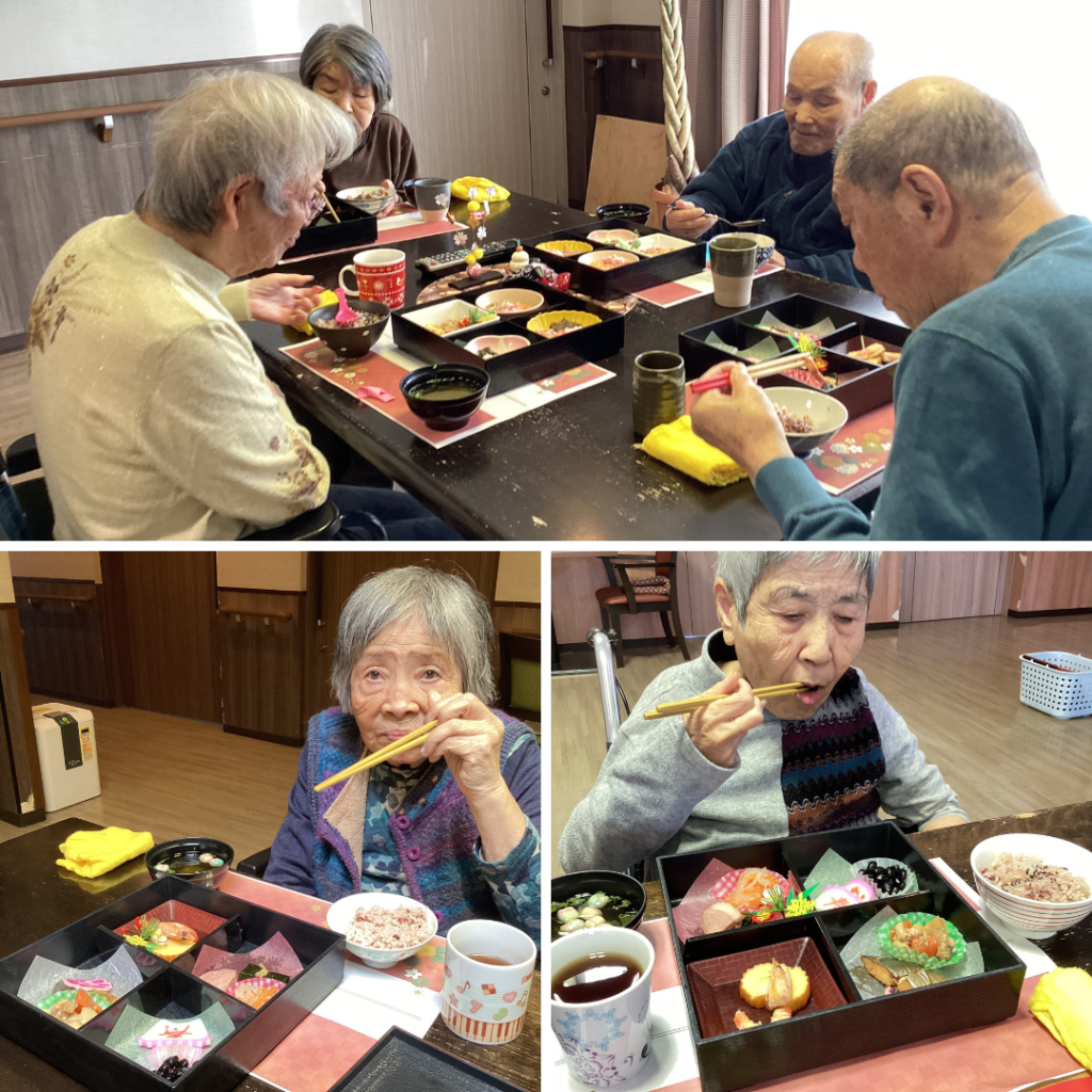 お正月には、皆様でおせち料理をいただきました。「ごちそうだね」「おいしそう」といった声が聞かれ笑顔あふれる時間となりました。
