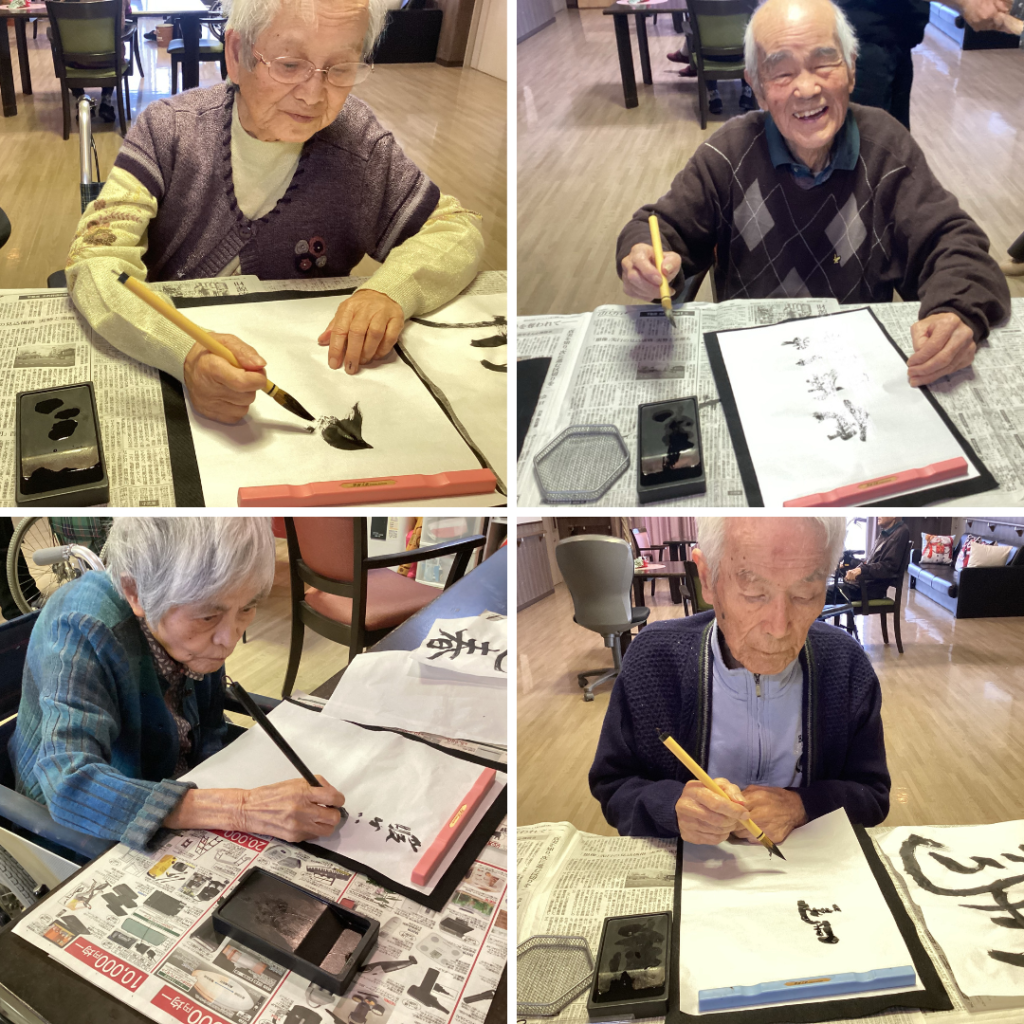 お正月に書初めと羽子板を使った風船バレーを行いました。書初めでは、真剣な表情で筆を持つ姿が印象的でした。