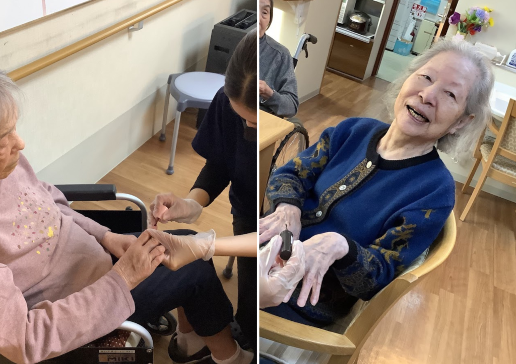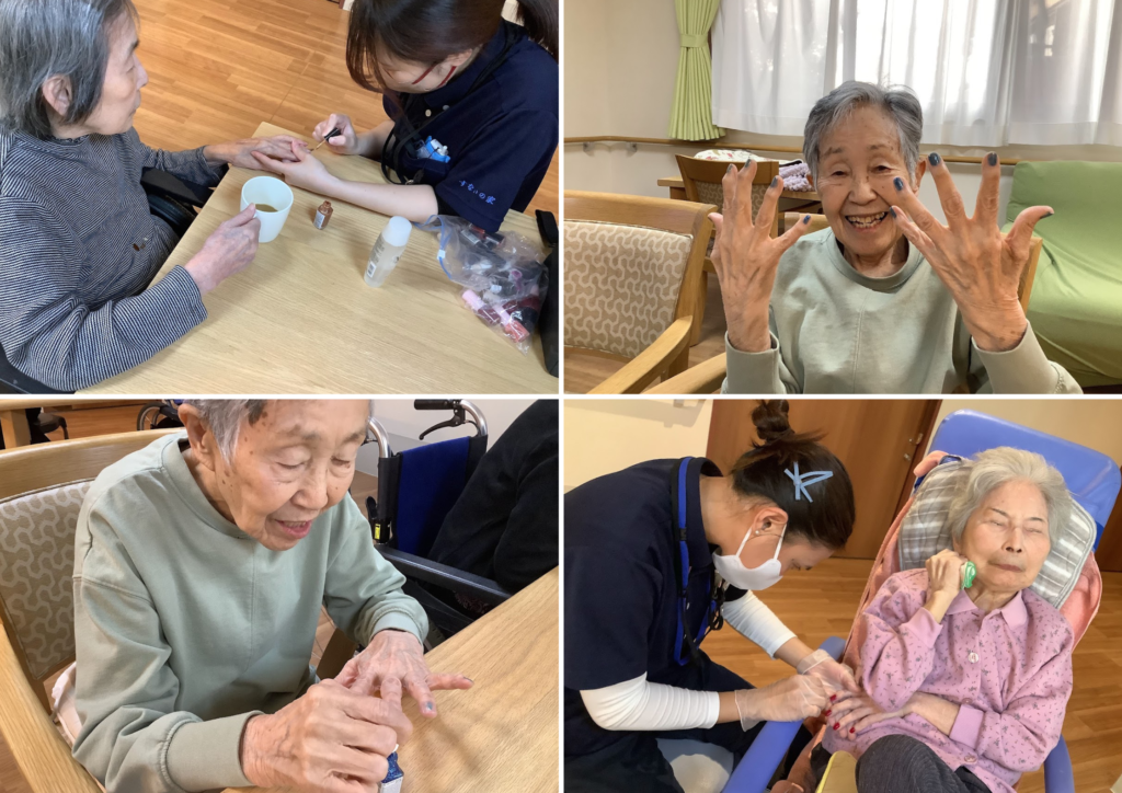 「お化粧がしたい」という入居者さんの声からネイルを行いました。初めてのネイルに「こんなことしたことない」「どうするの?」と少し照れたように質問される方や「若いころはやっていたよ」と懐かしそうに話してくれる場面もみられました。