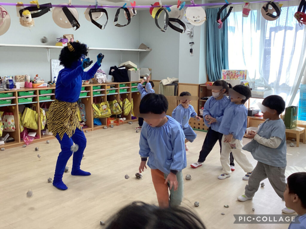 最初は何が起きたのかわからずにポカンとする子もいましたが、鬼だと気づくと、勇敢に豆を投げる子、怖くて泣いてしまう子・・・