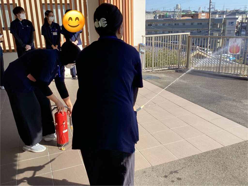 消火訓練では、火災を最小限に抑えるために、消火器の使い方を学び、実際に水の入った消火器を使ってみました🧯
