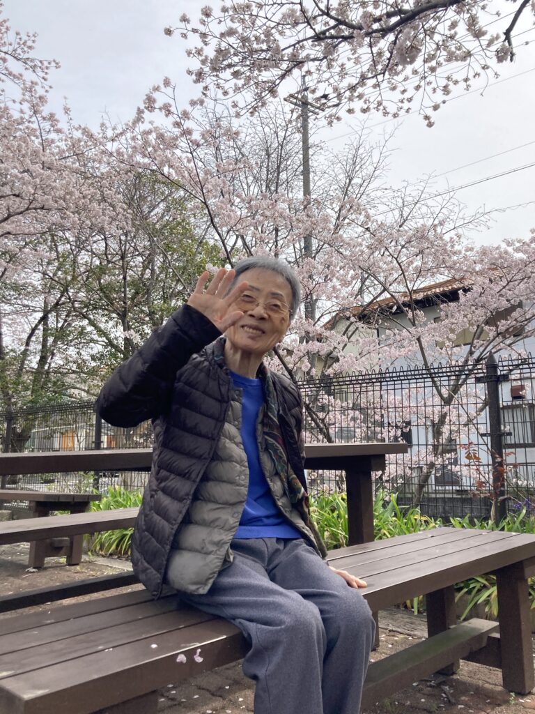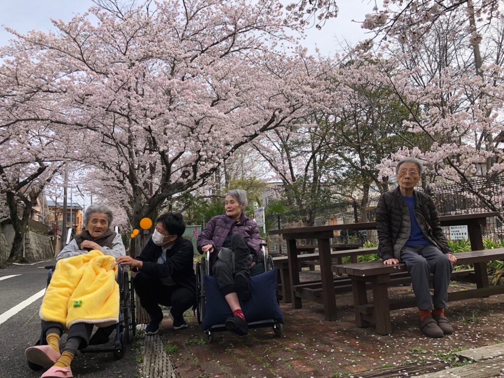 施設の近くにある住宅街に桜並木を見に行きました。お天気も良く、暖かく、花見日和になりました。桜並木の途中で車から降り、ベンチに座り、満開の桜を見上げるとにっこり笑顔になりました。