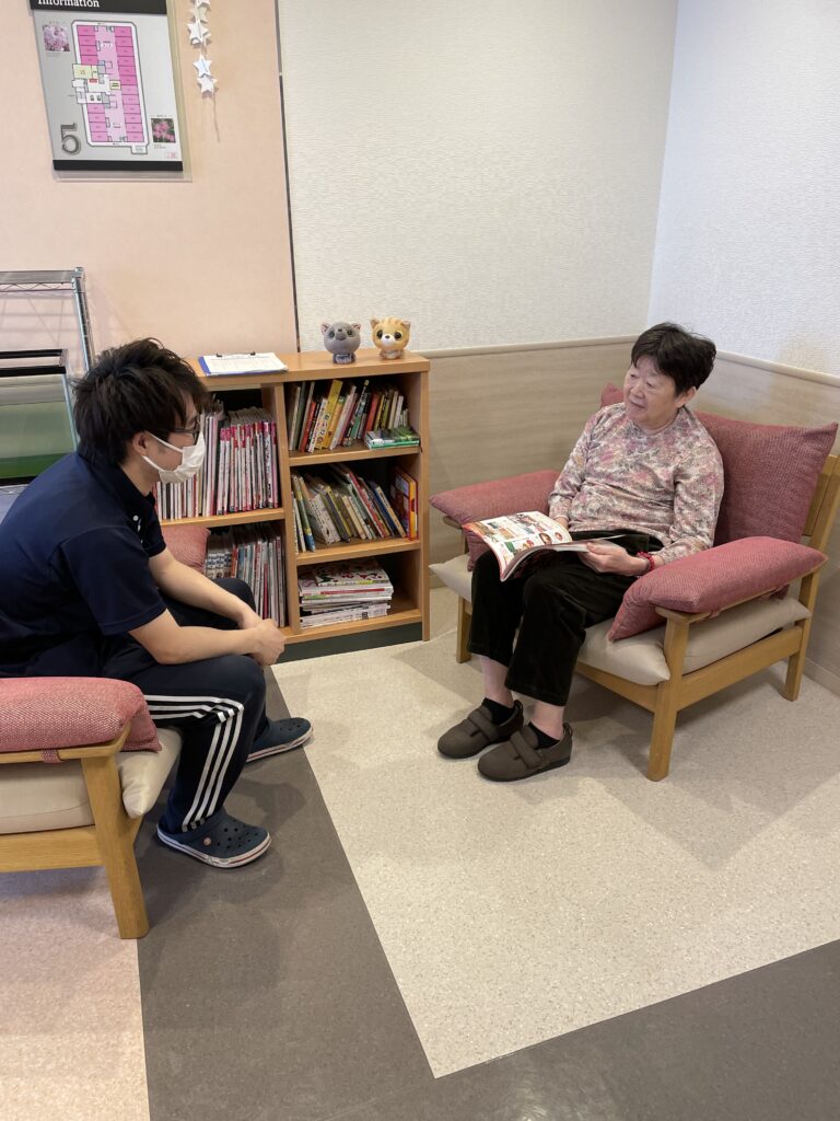 「すないの家千種」では、認知症ケア委員会で何かいい支援がないか話し合い、職員が家では不要となった本を持ち合い、5階エレベーター前のセミパブリックスペースに「図書館」を設置しました。ソファーでくつろぎながら本を読んでいただいても、貸出簿に記入して居室に持ち出してもいただいても、いいこととしました。