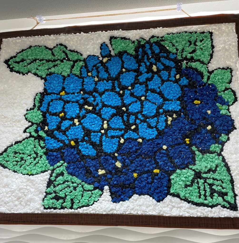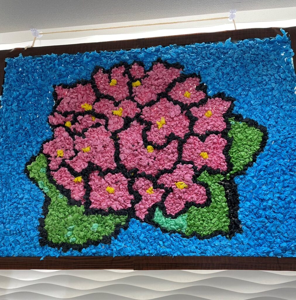 「すないの家千種」のホールに大きなアジサイが咲きました。このアジサイは入居者の方が、お花紙を1つ1つ小さく丸めて貼り合わせたものです。