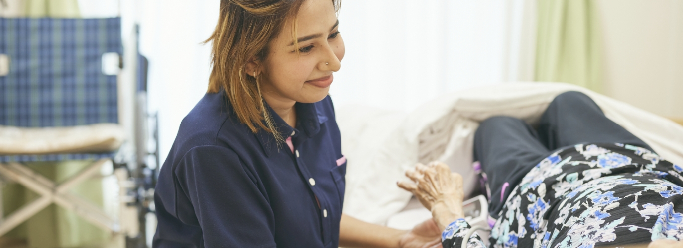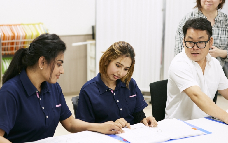 現地で日本語の勉強をしっかりされていたり、母国で看護師をしていた方が日本で介護の仕事をはじめたりと、「すないの家」でも優秀な外国人人材が多く活躍しています。日本で介護福祉士の資格取得を目指すひとも多く、みんな意欲的で真摯な姿勢で仕事に取り組んでおり、「心の介護」を実践しくれる人材として各施設で欠かせない存在となっています。技能実習生