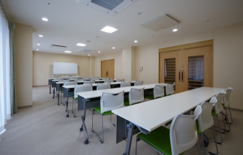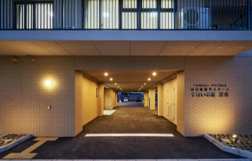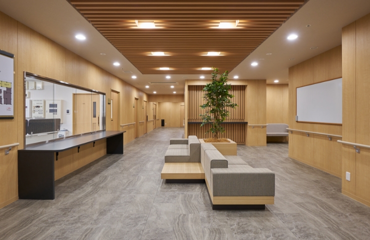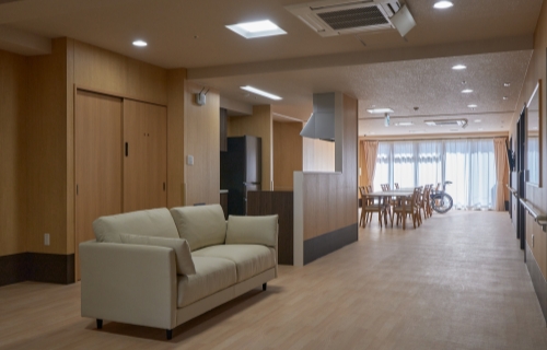施設入口はバス通りに面しているため、駐車場は裏手になります。施設内には地域の方とのボランティア交流などに使用する地域交流ホールもあり、ご家族をお招きしてのイベントや行事も実施しています。すべて使いやすさ、居心地のよさを重視した設計となっており、入居者さまが多くの時間を過ごされる共同生活室や居室は明るく開放的な空間であることにこだわりました。