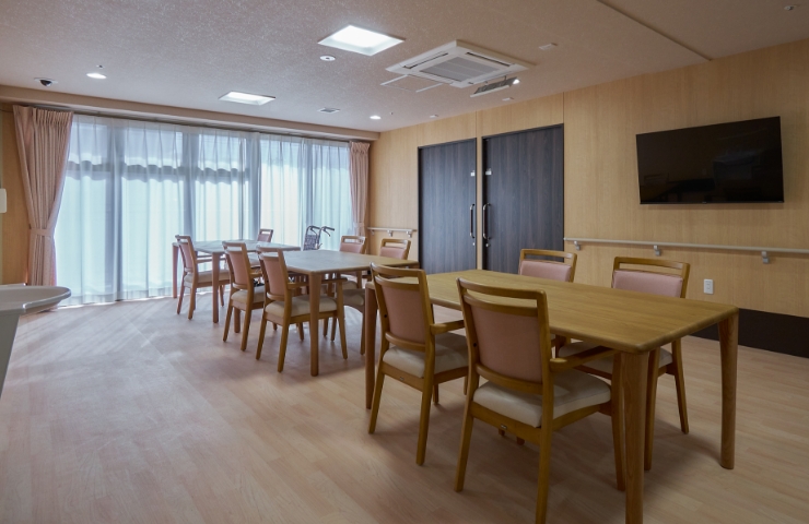 各個室の中央にある共同生活室では、食事やお茶をしたり、レクリエーションをしたりとみんなで楽しく過ごします。すべて木材を使った家具を使用しています。