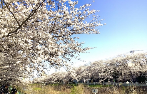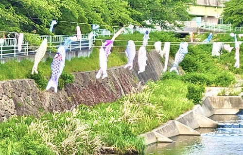 近隣にある香流川は自然豊かで、春は満開の桜、初夏には新緑と鯉のぼり、秋冬も川の流れを感じながら気持ちよくお散歩できます。施設そのものは都市部の住宅街ですが、すぐそばに自然を感じられる景色もたくさんあるのがこの立地の特徴です。香流川の春の景色をイメージした作品づくりにも取り組み、皆さんで協力して施設の中にも美しい紙の桜を咲かせました。